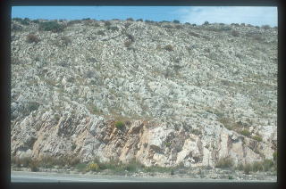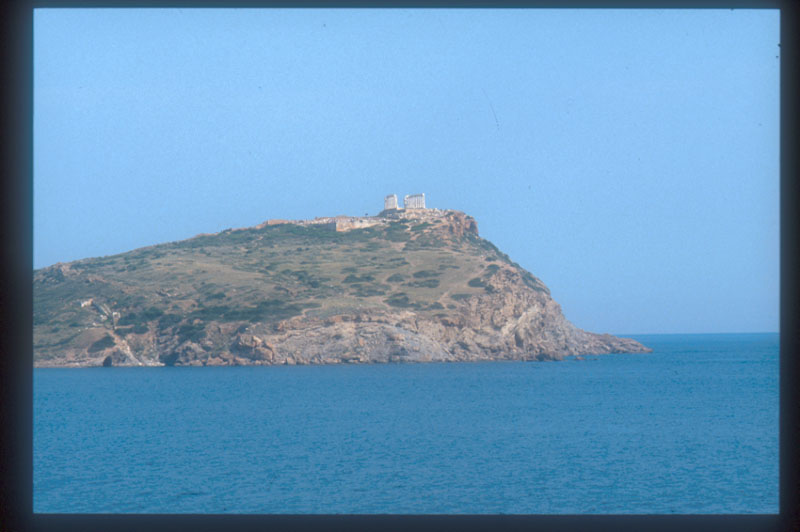 12.スニオン岬の景観 アテネの東には、先端にポセイドンの像が残るスニオン岬がある。途中、特に海岸線は石灰岩剥き出しの荒れ地。所々には山火事の痕もあり、普通の植物はとてもまともに生育できそうもない。アテネ周辺には、水の流れている川が無い。生活用水は、はるか北部の山岳地方から水道管で引いているそうである。岬の先端 |