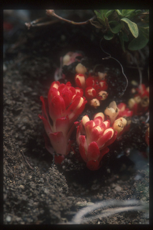 6.Cystinus hypocitus(寄生植物) 落葉樹の根元で、殆どが地中に埋まり、先端部だけが顔を出していた。日本産のツチトリモチやヤッコソウとも異なり、むしろギンリョウソウに近縁か。びっくりするほど鮮やかな朱紅色であった。地中に埋まっているのに、なぜこの様に目立つ色なのか不思議である。拡大 |