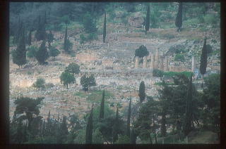 9.デルフィーの遺跡 オフリスを訪ね、イタリアからギリシャに飛んだ。唐澤氏と分布図を検討し、アテネから車で約4時間、パルナッソス山の中腹にあるデルフィーの遺跡を訪ねた。5月初旬で、初めは晴天であったが、昼食中に突然雪が降り出し、あっという間に積もった。有名な遺跡であるが、余り観光地化していない良いところであった。拡大 |