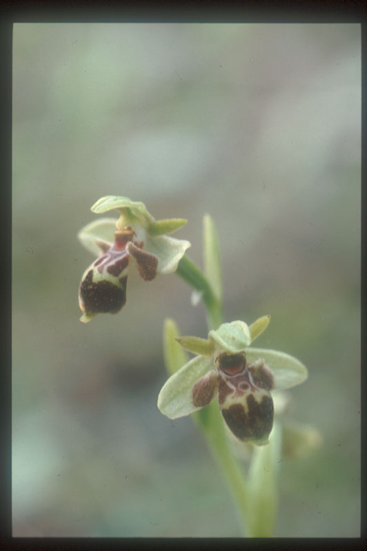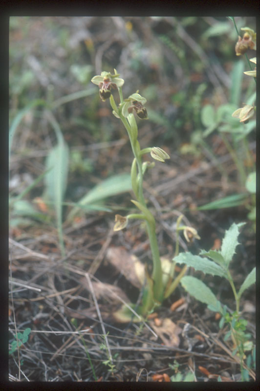 | 10.Ophrys sphegodes 遺跡周辺は、石灰岩が剥き出しの場所が多く、こんな所にあるだろうかと心配になったが、道路際のやや湿った茂みの中でこの株を見つけた。大きな花で、長さは3cm強あった。イタリアの種に比べ、全体大柄、いかにもビーオーキッッドというオフリスであった。 拡大、別種か |
