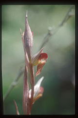 14.Serapias parviflora セパルとペタルは重なり合って筒状となる。反り返り気味に下に伸びているのが唇弁。基部内面には、細毛が密生している。少なくとも我々に感知出来るような香りも無く、昆虫は何故この花に飛んでくるのであろう。殆どの花が結実するようである。拡大 |