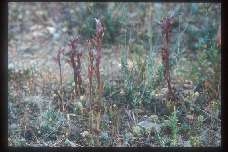 | 13.Serapias parviflora 内陸部の道路際、カラカラに乾燥した草地にあった。高さは10-15cm、基部に2-3枚の短い葉があるだけ、花も茶色系で本当に目立たないので、最初の1株に気付くまでが大変。地上部が貧弱な割には、地中の塊茎が大きい。共生する菌が活躍しているのであろう。拡大 |