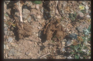 11.オフリスの新旧の塊根 オフリスもオルキスも草姿、塊根の形態は同じ。オルキスの語源は、精嚢(これ以上は書けません)。前年に形成された塊根から新芽を出し、地上部が枯れるまでに新しい塊根が出来る。このため秋から春までは新旧2つの塊根がある。このため昔から、精力剤として、摺り潰したものが片栗粉と同様に飲用されてきた。拡大 |