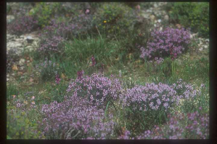 8.Polygala caeensis 開けた明るい林床に群生する。鮮やかなブルーと白の花である。どの植物を見ても、花の色が鮮やかである。この地方は地中海沿岸地域とはいえ、緯度だけで比較すれば、日本の中部より北である。花色が美しいのは、空気が汚れていない事に加え、紫外線が強いのであろう。拡大 |