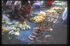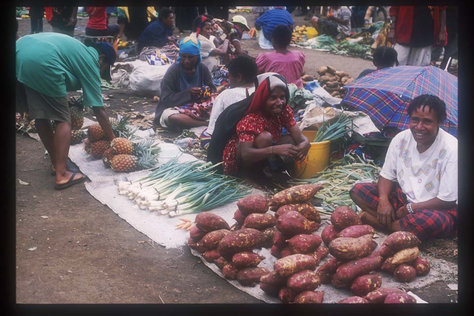 10.ゴロカのマーケット 高原の町ゴロカには、飛行場もある。そのすぐ近くにあるマーケットでは、食品から雑貨、衣料品まで売られている。日本でも馴染みのある野菜や果物が多い。束ねられているのが落花生、その横がタロイモ。拡大 |