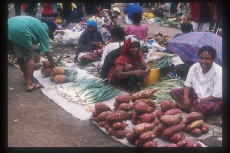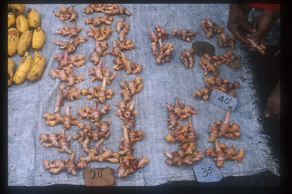 11.ショウガ 一人の売り場面積は1-2u、村から徒歩或いはバスに乗って売りにくるらしい。日本のように醤油やソースが無いので、ショウガは大事な調味料なのであろう。拡大 |