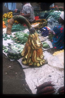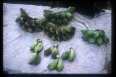 12.バナナ1 マーケットには様々なバナナが売られていた。特に変わった形をしていたのがこれ。このマーケットでは捨てられた野菜の葉などのゴミはそのまま積み上げられ腐るに任せ、その横で何かを売っている。拡大 |
