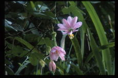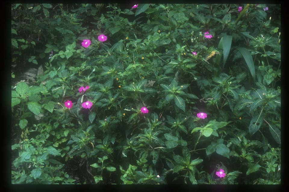 6.Impatiens(ピンク) 道路際のやや湿った場所に生育し、株は直径1-2mになる。大きな花も小さく感じるほどである。アフリカのインパティエンスよりがっしりしている。最近では様々な園芸品種もあるようだがやはり自生地で見るものには敵わない。拡大 |