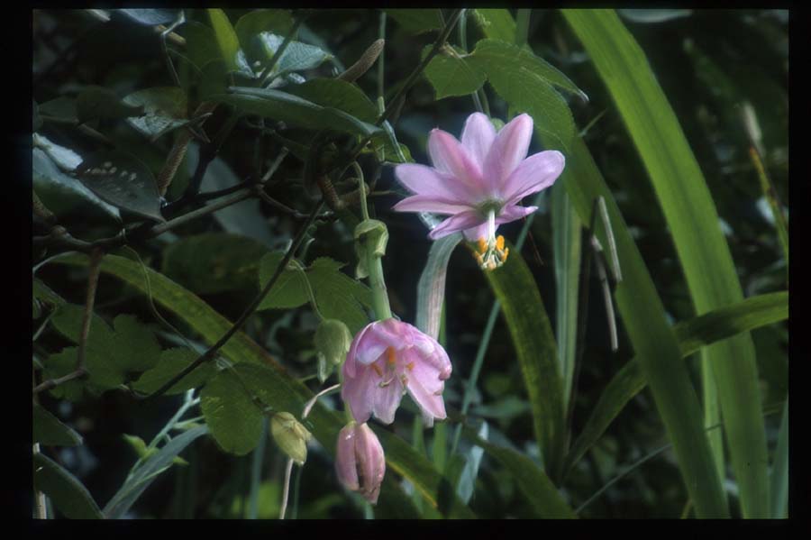 | 1.トケイソウの花(Passiflora) 淡桃紫色で弁質も厚く、しっかりとした大きな花で直径6-7cm。日本で栽培されているトケイソウとは全く異なる。ダウロ峠周辺の道路際に沢山あった。切通しの上の方、しかも風で揺れるので撮影はなかなか難しい。 拡大 |