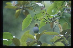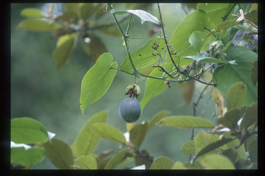 2.トケイソウの実 丁度卵位の大きさ、写真の実はまだ熟していないので暗紫色であるが、熟すと茶色を帯びた薄いオレンジ色となり、非常に美味い。パプアニューギニアでも、この辺りにしか生育しておらず、日本に輸出したいとの話もあるらしい。 拡大 |