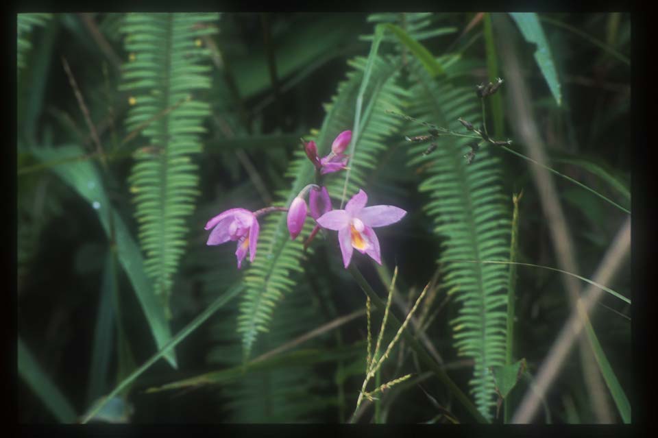 7.Spathoglottis plicata 東南アジア全域に広く分布し、琉球列島にもある地生ラン。地中に大きな塊茎から直立する花茎をだす。花の変異幅も広く、開花せずに結実する閉鎖花の個体も見られる。この地域でも半数近くが閉鎖花であった。拡大 |