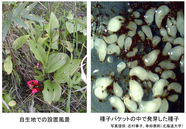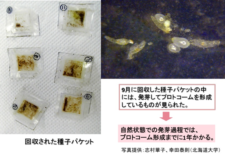 我々はその一連のレブンアツモリソウ保全プロジェクトの中で、共生菌を用いた共生培養系の確立を担当し、これまでに、レブンアツモリソウの根から分離した菌を用いて効率的にレブンアツモリソウ共生発芽個体を得る方法を確立した。人工増殖法として共生培養を用いたのは将来的に自生地への植え戻しを考慮してのことである。自生地復元のために共生発芽苗を植え戻す場合、レブンアツモリソウにとっての生育適地がどのような場所なのか知る必要があり、次世代の種子発芽のための共生菌が存在するかどうかは生育適地にとって重要な要因である。そこで我々は、種子パケットを用いた菌根菌分布調査を行うことで自生地での最適な植え戻し場所の検討を試みた。種子パケットはレブンアツモリソウの群落がある区画レブンアツモリソウが全くない区画など様々な植生を選んで設置した。パケットの回収は設置1年後の秋に行い、パケット内のプロトコーム数および生育程度を観察した。その結果、発芽は必ずしも親株の近辺でのみみられるわけではなく、親株から数メートル離れた場所でも発芽がみられることがあった。さらに、レブンアツモリソウが全くない場所でもプロトコーム形成はみられた。このような区画には主にヒノキ科ハイネズが生育しており、ハイネズ菌根菌とレブンアツモリソウ共生菌との関連が想定された。3カ年に渡る調査で、やはりハイネズの分布とレブンアツモリソウの共生発芽とは関連があり、ハイネズとともに生育する菌類(外生菌根菌)がレブンアツモリソウの共生菌であり、3者間の共生関係が存在しているのでははないかと考えられた。PCRによる検出では、これまで分かっているレブンアツモリソウ共生菌がハイネズの根から検出されているが、現在さらに、レブンアツモリソウ共生発芽能をもつ菌がハイネズから分離されるか試験中である。また、菌を介したハイネズとレブンアツモリソウ間の養分移動も調査しており、現在、ハイネズから菌、菌からレブンアツモリソウへの養分移動が確認されている。